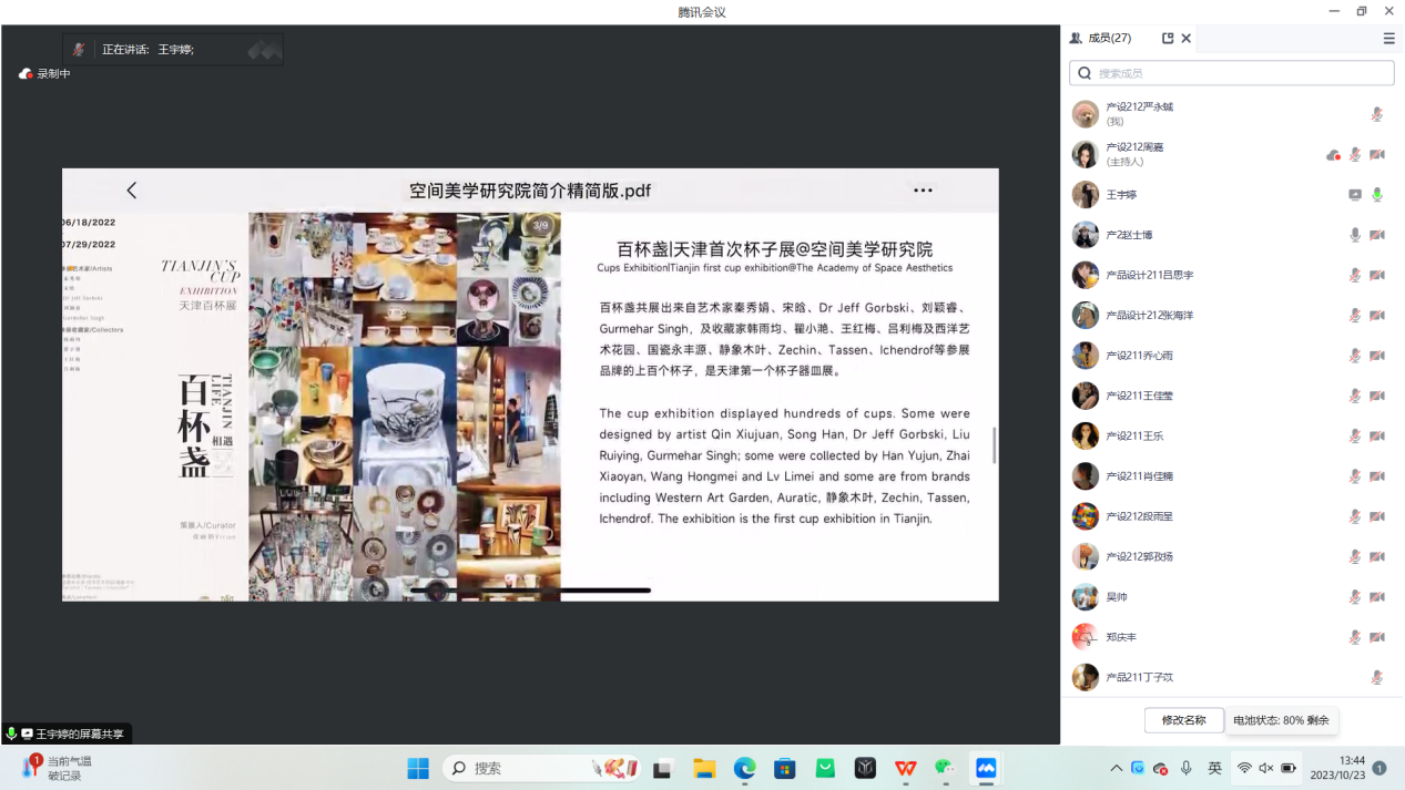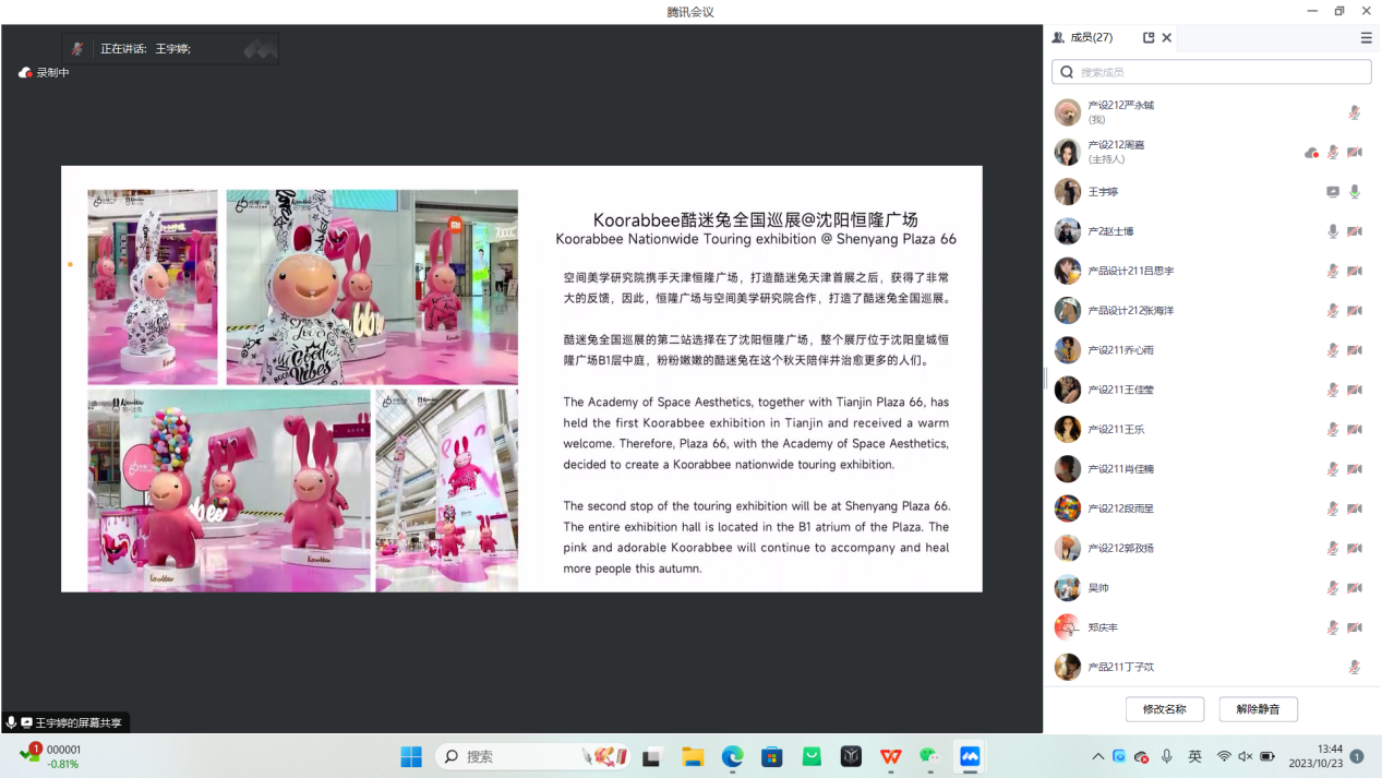 近日,产品设计专业“数智文”工作室与企业联合开展《文创产品设计》课程教学。10月23日课程邀请优秀企业导师王宇婷在线上为21级同学进行讲解展览策划、IP设计及应用等方面的知识。课程由知启国际文化传媒(天津)有限公司创始人王宇婷主讲,采用线上腾讯会议直播教学方式,开启了本次课外在线课堂学习之旅。
