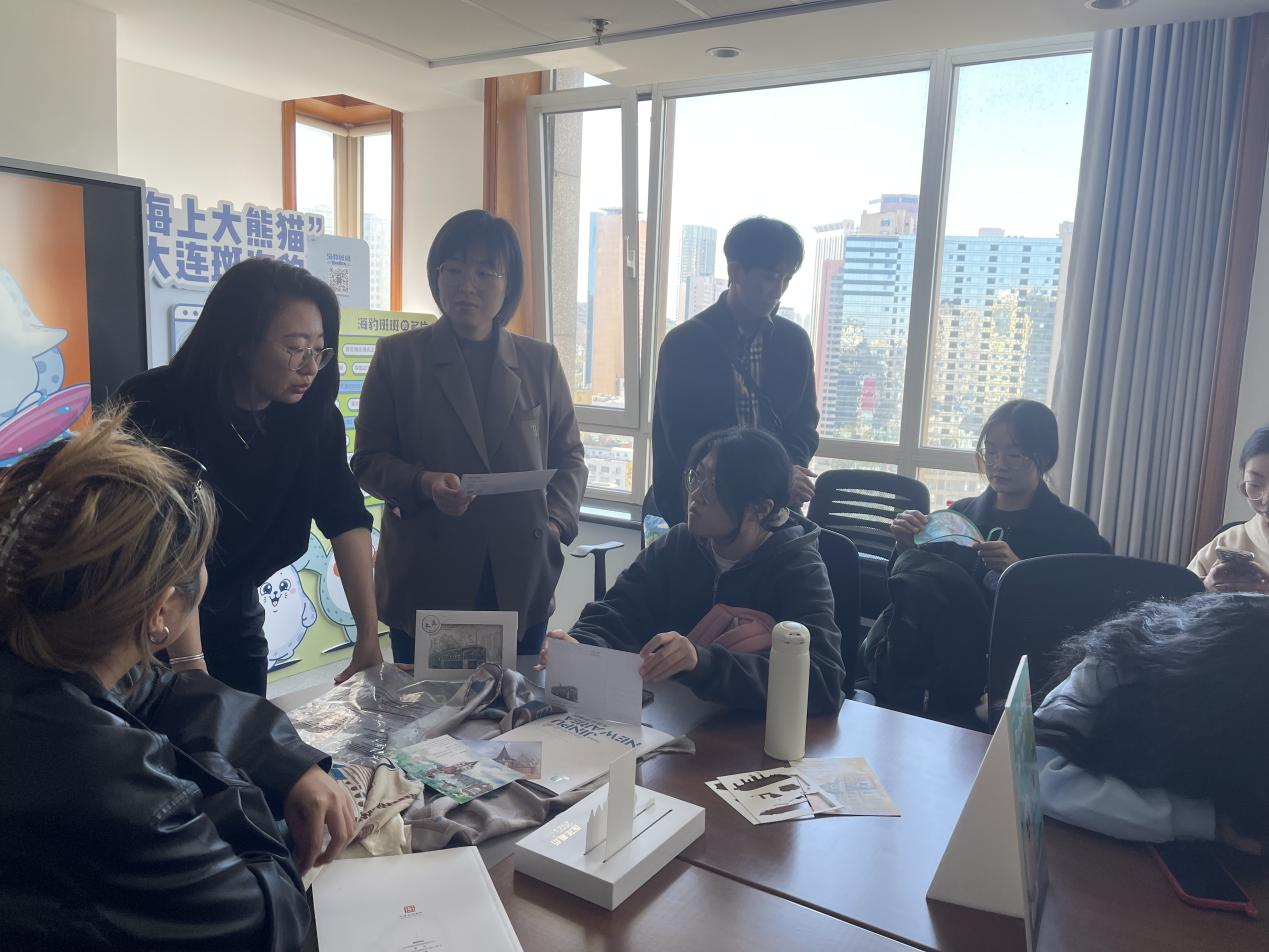10月26日上午,“数智文”工作室21级同学由单阳老师带队前往位于中山区的大连东方视野文化传播有限公司实地参观、学习,受到热烈欢迎与亲切接待。企业导师刘潇为同学们详细地讲解了公司的文创项目开发过程、IP设计来源、大连城市文创设计案例(海豹斑斑、城市系列、自然知物、记忆大连等系列),并和同学们分享了在文创投入市场过程中可能遇到的问题。最后,企业导师刘潇结合《文创产品设计》课程要求提出“大连城市文创”主题的企业课题,让同学们选择并参与其中。