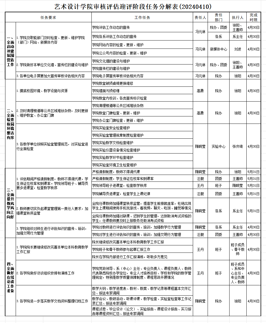 4月18日上午9:00,学院召开本科教育教学审核评估冲刺阶段工作部署会议,按照学校《线上评估工作安排》,全面启动教风、学风提升工作、校园环境整洁有序工作和在线访谈准备工作。学院班子成员、各专业负责人、各系主任、副主任、中心主任、支部书记、团委书记、院办人员出席了本次会议。会议由院长王丹主持并做了动员讲话,副院长隋晓莹对迎评工作任务进行了详细任务解读,书记冯元林最后做了总结讲话,要求切实把工作任务落实到每一个人,做到人人有任务,事事有人管,全院上下齐心协力做好迎评最后冲刺准备。