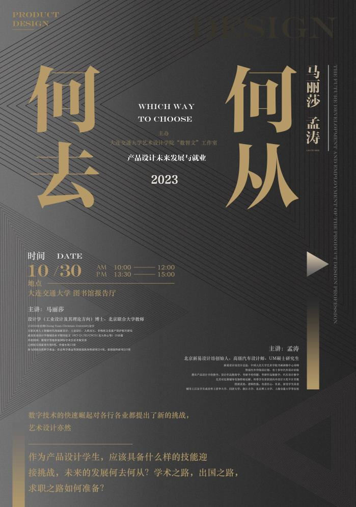 2023年10月30日,“何去何从”——产品、工业设计未来发展系列主题讲座在旅顺校区图书馆报告厅举行,本次讲座邀请艺术设计学院校友、武汉理工大学设计学(工业设计方向及其理论方向)博士、北京联合大学教师马丽莎,以及高级汽车设计师、UM硕士研究生、北京新易设计坊创始人孟涛作为两场讲座的主讲人。讲座由设计系“数智文”工作室承办,工作室负责人单阳主持,产品设计、工业设计等两百多位师生参与了讲座并交流。