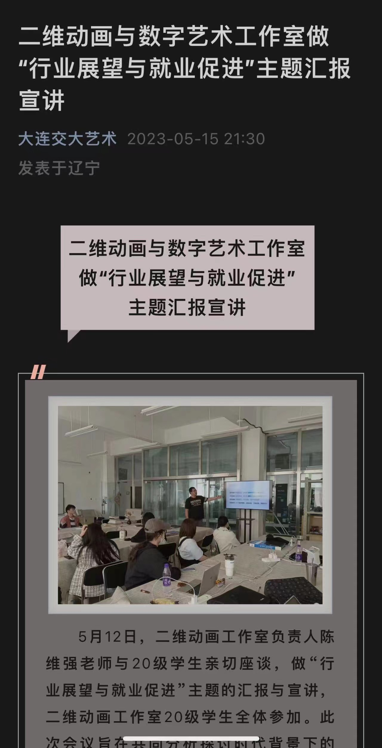 艺术设计学院全面实行工作室制,各工作室根据市场用人需求实时调整培养方案和教学计划,对接用人单位,落实工作室就业责任制。学院高度重视学生就业工作,把就业工作放在第一位,院中层会每周通报一次就业情况,会上工作室对未就业学生逐一进行情况说明;院全体大会对就业落后的工作室进行通报并责令整改。